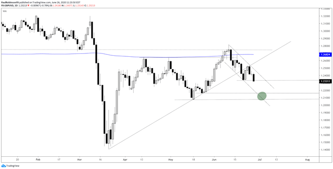 The downtrend off the month high looks poised to continue, with potential for a material drop in the days ahead. On the week ending June 19, GBP/USD broke the trend-line from the March low, putting it into a vulnerable position.